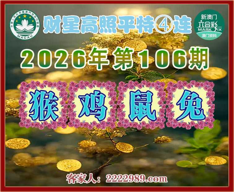 106期:《财星高照》 平特④连【猴鸡鼠兔】开:猴11,鸡22,鼠31,兔40